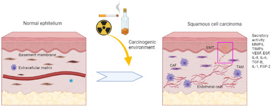 Multistage process of squamous cell tumourigenesis. The mucosa exposed to risk factors with a carcinogenic environment can alter the homeostasis and genetic stability of cells. This leads to increased signalling for cancer progression through uncontrolled cell proliferation and growth. Local invasion and stromal changes are promoted. Growth factors such as FGF-2, EGF and VEGF and inflammatory mediators such as IL-8, IL-2, IL-6, TIMPs and MMPs play a crucial role in BM and ECM breakdown. Decreasing intercellular adhesions and decreasing E-cadherin ends up promoting tumour development and local invasion, which can reach other tissues through blood vessels.