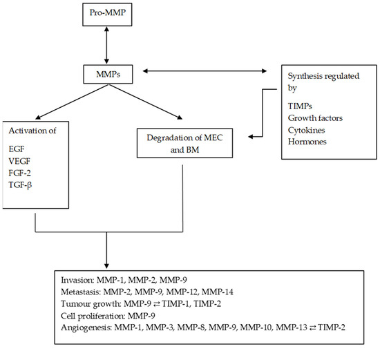 MMPs are a family of endopeptidases responsible for dissolving the ECM and the BM. Figure 2 summarises the main processes in which MMPs are involved. They are produced by various inflammatory and connective tissue cells such as the following: fibroblasts, lymphocytes, endothelial cells and macrophages. And its synthesis is strictly regulated by hormones, growth factors, cytokines and TIMPs [27].