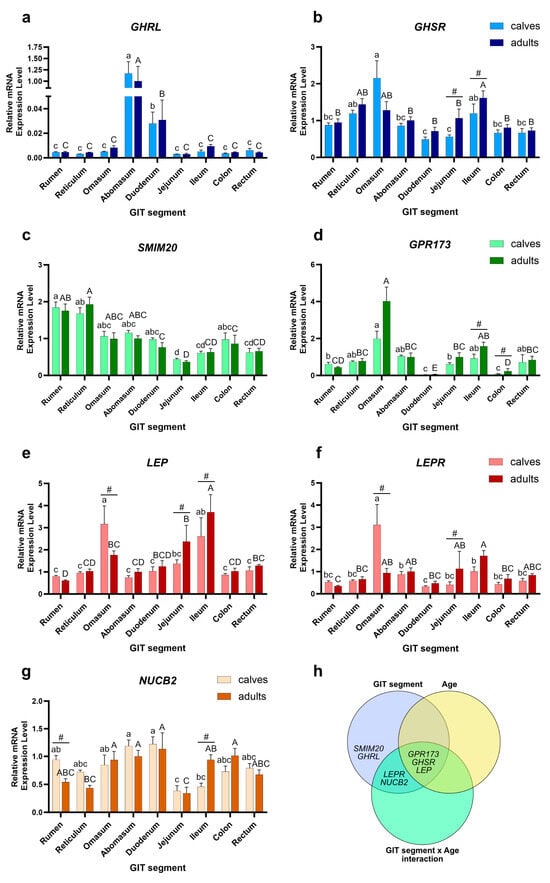 Gene expression levels. The relative expression of genes (a) GHRL, (b) GHSR, (c) SMIM20, (d) GPR173, (e) LEP, (f) LEPR, and (g) NUCB2 in the examined bovine GIT segments, (h) Venn diagram summarizing the genes measured for which GIT segment, age, or their interaction had a significant impact on their relative mRNA expression levels as tested by the two-way ANOVA. Expression was normalized using the geometric mean of housekeeping genes RPS9 and ACTB and is presented relative to the levels observed in the adult abomasum. Different lowercase letters denote significant differences between GIT segments in calves, while different uppercase letters denote significant differences between GIT segments in adult individuals (p < 0.01). A hash (#) highlights significant differences in mRNA expression between calves and adults within a specific GIT segment (p < 0.01). Owing to the exponential characteristics of relative mRNA expression computed via the −ΔΔCT method, the geometric means along with SE (standard errors) are presented.