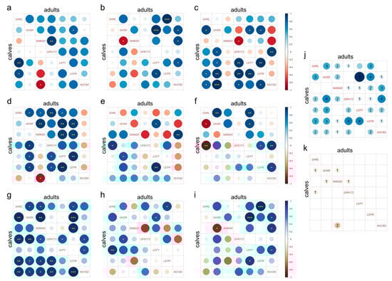 Correlation plot analysis. The correlation among expression patterns for GHRL, GHSR, SMIM20, GPR173, LEP, LEPR, and NUCB2 in (a) rumen, (b) reticulum, (c) omasum, (d) abomasum, (e) duodenum, (f) jejunum, (g) ileum, (h) colon, and (i) rectum, for both calves and adult individuals. The correlation type is indicated by the color, with blue representing a positive correlation and red representing a negative correlation. The size of the dots reflects the magnitude of the correlation coefficient. Statistically significant correlations are marked with asterisks (* p < 0.05, ** p < 0.01, *** p < 0.001). The total number of significant (j) positive and (k) negative correlations among the expression levels of the seven analyzed genes in the GIT segments for calves and adults is presented.