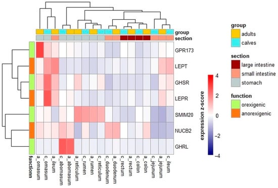 The heatmap analysis showed that, in most GIT segments, gene expression patterns were similar between calves and adults. However, a remarkable disparity in gene expression between the two groups was found in the ileum, as the pattern of genes expression in the adults’ ileum is clustered with genes expression pattern in the omasum of calves and adults. Generally, the highest levels of gene expression were found in the forestomachs and abomasum. No clustering was observed based on the peptide type (orexigenic/anorexigenic) (Figure 3).