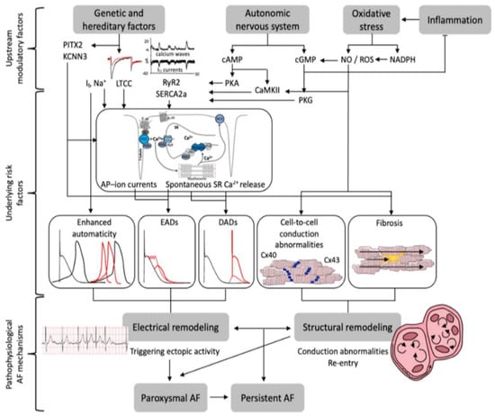 Pathophysiological mechanisms underlying the initiation and maintenance of atrial fibrillation (AF). Summary of upstream modulatory factors, underlying risk factors, and pathophysiological AF-associated mechanisms. Abbreviations: PITX2, paired-like homeodomain transcription factors 2; KCNN3 = Potassium Ca2+ctivated Channel; If = funny current; LTCC = L-type Ca2+ channel; RyR2 = ryanodine receptor 2; SERCA2a = SR− Ca2+ ATPase; cAMP, 3′,5′-cyclic adenosine monophosphate; PKA and PKG, protein kinase A and G; CaMKII = Ca2+-calmodulin dependent protein-kinase type-II; NO = nitric oxide; ROS = reactive oxygen species; NADPH =nicotinamide adenine dinucleotide phosphate; cGMP = cyclic guanosine monophosphate; AP = action potential; SR = sarcoplasmic reticulum; EADs/DADs = early/delayed afterdepolarizations; Cx40/43 = connexin 40/43; AF, atrial fibrillation. Source: [26].