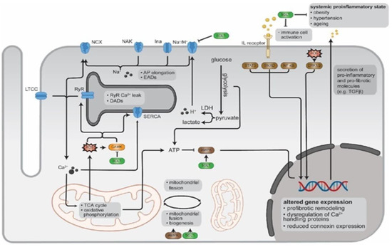 Inflammasomes play a crucial role in the innate immune response and the maintenance of tissue homeostasis. The NOD-, LRR-, and pyrin domain-containing protein 3 (NLRP3) inflammasome activates caspase-1 and mature ILs 1 and 18, which play significant roles in the cardiovascular system. In addition, high-cholesterol diets in the Western world can trigger inflammatory responses dependent on the NLRP3 inflammasome, thus influencing the reprogramming of the innate immune system. The inflammatory process involves the production of various cytokines, primarily generated by the mitochondria, through different molecular pathways associated with the elevation of ROS levels. This triggers the activation of the inflammasome NLRP3. The influence of acute and chronic inflammation, along with OS, has been associated with the triggering of atrial and ventricular fibrillation, as evidenced by experimental and clinical studies. Cardiovascular risk factors, such as hypertension, obesity, insulin resistance, metabolic syndrome, aging, and neurological disorders, cause a state of inflammation and OS, predisposing patients to heart arrhythmias. Disturbances in the redox state and an increase in pro-inflammatory cytokines can cause cardiac channelopathy, affecting ion channels and gap junction canals, such as connexin (Cx)43 and Cx40, as well as the activation of connexin hemichannels and abnormal calcium regulation. These changes are crucial in the induction and maintenance of atrial and ventricular fibrillation. Dysbiosis of the intestinal microbiota, which produces bioactive metabolites, can contribute to pro-arrhythmic, inflammation-related actions. Environmental factors such as air pollutants and artificial night lighting can also predispose patients to cardiovascular disorders related to inflammation and OS, thereby promoting heart arrhythmias. Therefore, connexin-hemichannel inhibition may be an effective strategy for treating inflammation and preventing arrhythmias. Furthermore, recent studies have revealed the inflammatory functions of heart immune cells, highlighting that leukocytes can be arrhythmogenic, affect tissue composition, or interact with cardiomyocytes. Recent studies have also identified the presence of genetically determined systemic inflammation in cardiovascular diseases, highlighting the NLRP3 inflammasome as a promising therapeutic target (Table 3) [53].