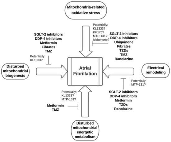 - Muszyński, P.; Bonda, T.A. Mitochondrial Dysfunction in Atrial Fibrillation-Mechanisms and Pharmacological Interventions. J. Clin. Med. 2021, 10, 2385. [Google Scholar] [CrossRef]