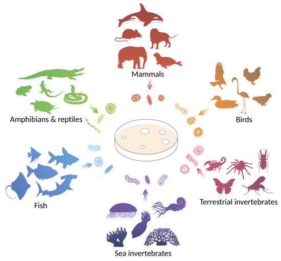 Microbes inhabit the organs of animals and the surface of their bodies, and in some cases, specialized organs are formed in the host organisms to contain cultures of symbionts [22]. Despite the ubiquity of free-living forms of bacteria, fungi, and archaea, most associations of microorganisms with animals turn out to be established. Since their inception, multicellular organisms have evolved together with microbial communities. The hologenomic model of animal evolution is currently being considered, in which animals act as units of natural selection together with symbiotic microflora [17,22,23]. The host animal supplies the microbial community with nutrients and ensures the relative stability of the environmental conditions. Microorganisms compete with each other and influence the host. The microbiota participates in maintaining the metabolic and immune functions of the animal, providing additional protection against pathogen invasion [22].