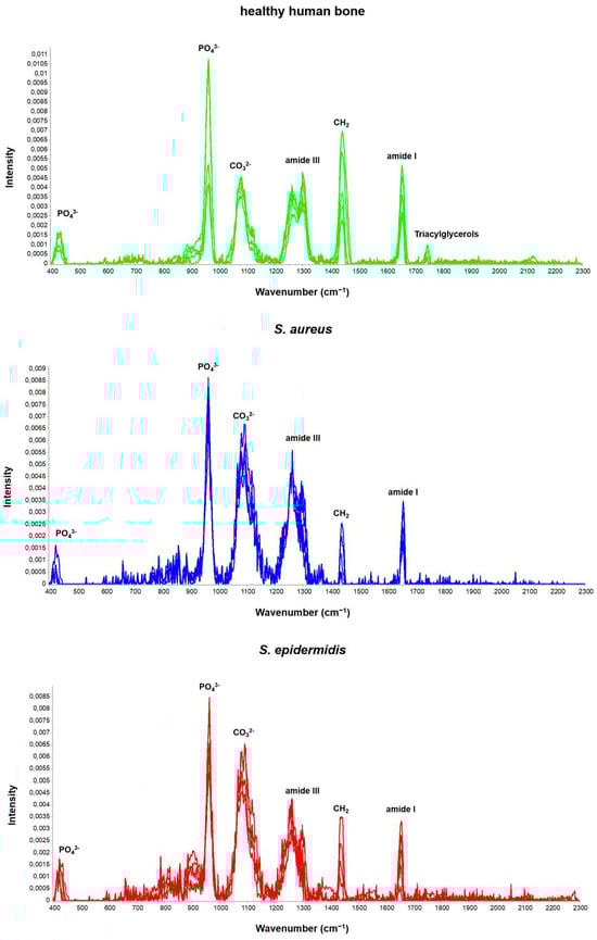 Through an analysis of the Raman spectra, we gained valuable insight into the chemical composition of the bone tissue under examination. In Figure 1, we observe the spectra from five spectra recorded from five different positions of a bone sample devoid of any infection, one contaminated with Staphylococcus aureus, and one infected with Staphylococcus epidermidis—the most prevalent pathogens in osteomyelitis cases.
