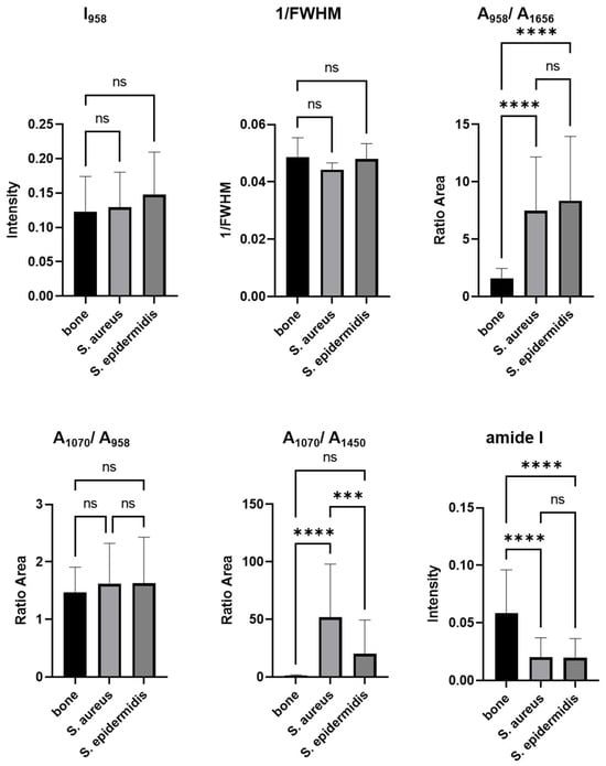 Significant differences exist between a healthy bone sample and one infected with Staphylococcus aureus in various parameters, including phosphate, amide I, mineral–matrix ratio (ratio of phosphate to amide I), and mineral carbonate content (MinCarb). In contrast. Comparing an uninoculated sample to one inoculated with Staphylococcus epidermidis reveals nearly indistinguishable results, except for a slight variation in the calculation of mineral carbonate content. However, comparing bone samples infected with Staphylococcus aureus and Staphylococcus epidermidis highlights a considerable difference in mineral carbonate content.