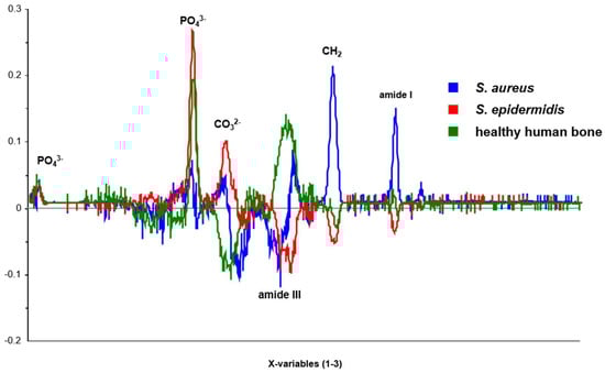 PCA is an essential diagnostic tool for making quick and accurate treatment decisions [63]. In this experimental study, PCA was utilized to visualize changes in bone tissue by analyzing the mean spectra of 120 bone samples. The first principal component is based on the Raman spectra of 40 bone chips that were not inoculated. The second principal component consists of 40 bone chips previously inoculated with Staphylococcus aureus, and the third principal component comprises 40 samples with the bacterium Staphylococcus epidermidis. It is imperative to utilize PCA in diagnostic procedures to ensure accurate and efficient results in bone tissue analysis. During the first stage, bone samples were compared using Raman spectroscopy to determine if it was possible to differentiate between healthy and infected bone tissue. A “loadings plot” should be employed to identify the principal components and highlight the main variance in the dataset, which calculates and displays the correlation between individual variables. This plot consists of correlation coefficients, with a maximum value of 1 and a minimum value of −1, and is depicted graphically (refer to Figure 3). Values that are identical when comparing the three types of bone samples are represented by the zero line. Deviations in the positive or negative range allow for differentiation between the three principal components. It has been shown through this experimental study that such differentiation is possible.