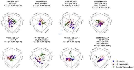 The detailed results of the PCA spectral analysis are shown in Figure 4 and Table 2. Table 2 shows that comparing uninoculated and infected bone samples using a principal component analysis yields results that are almost identical to the statistical results. In the context of a PCA, only the first two principal components, PC-1 and PC-2, are usually considered since these already contain 95% of the investigated information. The percentage distribution of the principal components for the respective 3D score plots can be read from column 2 of Table 2. As already described, the parameters phosphate, the ratio of phosphate to amide I (mineral–matrix ratio), the mineral carbonate content (MinCarb), and amide I are significantly different when comparing a healthy with an infected human bone sample. From Figure 4, as well as Table 2, it can be seen that the 3D score plots numbered III, VI, and VII show the most significant results. Here, 3D score plot III is also due to the bone parameter phosphate at 958 cm−1; 3D score plot VI describes the CH2 stretching (wagging) at 1450 cm−1, which is used to calculate the mineral carbonate content (MinCarb); and 3D score plot VII represents the amide I band at 1656 cm−1, from which the mineral–matrix ratio (MMR) can subsequently be calculated. Thus, principal component analysis (PCA), as the most accurate method to represent the correlation of bone-specific parameters, underscores the results obtained in this experimental study.