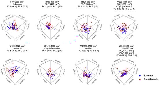 PCA for 3D score plots of the Mira handheld Raman instrument. I to VIII are the score plots between PC-1 and PC-2 for human bone infected with Staphylococcus aureus and Staphylococcus epidermidis.