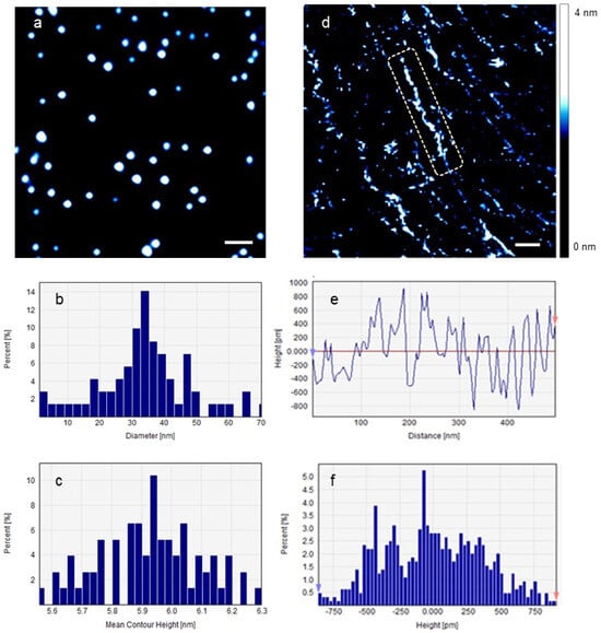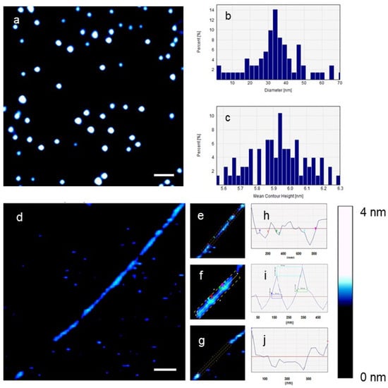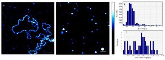 Figure 1a shows an AFM image of individual DNA plasmids in 0.1× PBS containing 1 mM NiCl2 before the addition of AuNPs. Their average deconvoluted width and height were 4.2 ± 0.7 nm and 2.3 ± 0.5 nm, respectively. Figure 1b shows an AFM image of small non-conjugated AuNPs (sAuNPs) on mica, in 0.1× PBS. The image reveals individual AuNPs that are uniformly distributed. The average diameter of 122 AuNPs was 16.57 ± 3.74 nm, and the average contour height was 5.4 ± 0.7 nm. Figure 1c,d present the distributions of the diameters and mean contour heights of the sAuNPs, respectively.