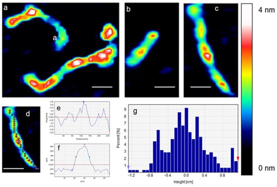 Figure 2a–c show the effect of non-conjugated sAuNPs on individual open circular DNA in 0.1× PBS. The open circular structure of the plasmid was no longer seen, and instead, beads-on-a-string features were observed. The average width and height of the DNA strings without the bead-like structures were 11.6 ± 3.2 nm and 1.76 ± 0.53 nm, respectively. In contrast, the average width and height of the DNA strings that contain beads (red features) were 16.9 ± 5.5 and 2.5 ± 0.63 nm, respectively. The tracking length (240 nm) of Figure 2d is seen in Figure 2e. Figure 2f shows a cross-section of one bead (red color) depicted in Figure 2d. This cross-section provides a closer look at the structure and dimensions of the bead formed by the wrapping of DNA around the sAuNP. Additionally, Figure 2g shows the height distribution of the structures observed in Figure 2d, providing information about the variation in height within the DNA bead structures. Scale bar = 100 nm, and z scale = 4 nm.