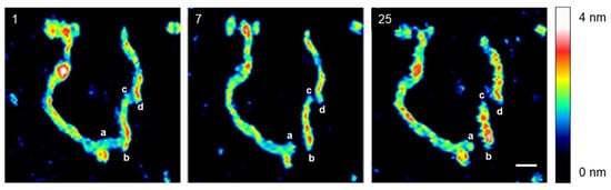 The time-lapse sequence (1–25 min) of AFM images capturing the effect of AuNPs on an individual DNA plasmid in a 0.1× PBS solution. Initially, after 1 min of adding AuNPs to the DNA solution, beads-on-a-string features were observed, likely due to DNA packaging around the AuNPs. Subsequently, at 7 min, the DNA molecule began to fragment at specific positions (a–b and c–d), possibly indicating the formation of double-strand breaks (DSBs). Over time, the length of the b–c fragment decreased, while its height and width increased, suggesting that the DNA molecule was experiencing stress.