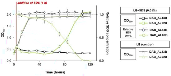 Growth of Psychrobacter sp. DAB_AL62B (green lines) and DAB_AL43B (negative control; black/grey lines) in the liquid medium supplemented with SDS to the final concentration of 0.01%. The bacterial cultures were preincubated for 4 h at 22 °C. Then, the cultures were divided into two flasks each, and SDS was added to one of the flasks, in which the OD600 was subsequently monitored (solid lines, squares). The flasks without SDS supplementation served as controls (solid lines, triangles). The SDS concentration in supplemented cultures was monitored concurrently (dashed lines, circles). The values plotted are the means of three replicates; error bars represent standard deviation.