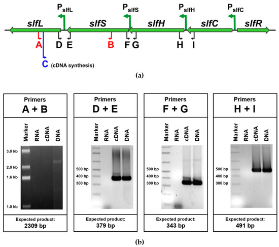 (a) Transcriptional organization of the SLF module. The orientation of the predicted promoter sequences is marked by green arrows. The letters A–I indicate binding sites for the primers used in the RT-PCR analysis, including the primers used for a negative control reaction (A + B, in red) and the primer used for cDNA synthesis (C, in blue). (b) Agarose gel electrophoresis of RT-PCR products. The analysis was performed using total RNA isolated from E. coli DH5α (pSLF1) grown in LB supplemented with SDS. The sizes of the amplified fragments were confirmed by comparison with the marker lane. Control reactions were performed with Dnase-treated RNA and pSLF1 DNA templates (negative and positive controls, respectively).