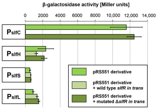 In order to analyze the promoter(s) located within the SLF module, DNA sequences upstream of the slfC, slfH, slfS, and slfL genes were separately amplified by PCR and inserted into the promoter probe vector pRS551 to generate transcriptional fusions with a promoterless lacZ reporter gene. The resulting constructs were introduced into E. coli MC1000, and β-galactosidase activity assays were used to quantify the strength of putative promoters (Figure 4). The results indicated the presence of (i) a strong promoter upstream of the slfC gene (PslfC), the main promoter of the identified operon, as well as (ii) three relatively weak promoters upstream of the genes slfH, slfS, and slfL (PslfH, PslfS, and PslfL).