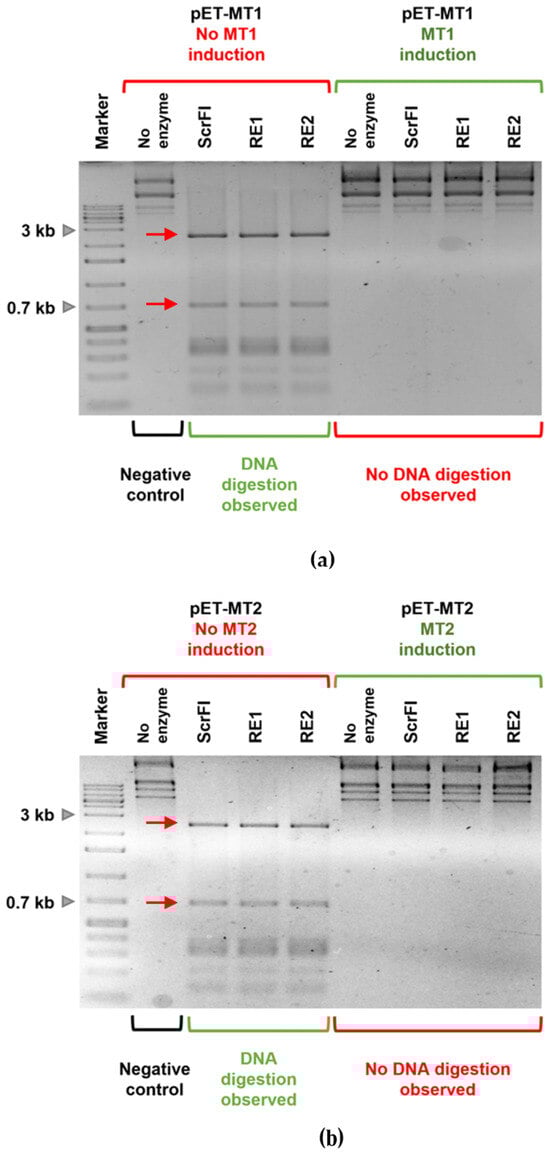 Digestion of pET-MT1 (a) and pET-MT2 (b) plasmid DNA by pP62BP1-encoded REases. The plasmid DNA was extracted from E. coli BL21(DE3). In both cases, digestion by the ScrFI restriction enzyme and the pP62BP1-encoded REases (RE1, RE2) was observed only in the case of the plasmid DNA isolated after the induction of MTase expression. A number of expected digestion products are visible, including the two largest fragments (2462 bp and 695 bp) indicated by red arrows.