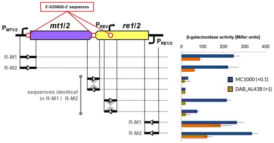 The genetic composition of each of the pP62BP1 R-M systems strongly suggested that the transcriptional organization of the modules might be crucial in the regulation of their activity (Figure 7). In both cases, the open reading frames encoding the MTase and the REase were oriented convergently in a ‘tail-to-tail’ manner, with overlapping STOP codons. Additionally, three 5′-CCNGG-3′ sites were identified within each system. In preliminary experiments, using β-galactosidase assays, we showed that in E. coli the following promoter sequences found within the pP62BP1 R-M systems were functional: (i) PMT1 and PMT2 for the MTase genes, located between a pair of imperfect inverted repeats of a 5′-CCGGG-3′ pentamer; (ii) PRE1 and PRE2 for the REase genes; and (iii) PREV promoters identified next to a 5′-CCAGG-3′ sequence within each REase gene in an reverse orientation with regard to the PRE promoters (Figure 7). While there were considerable differences between the nucleotide sequences encompassing the PMT1, PMT2, PRE1, and PRE2 promoters, the PREV sequences were identical in the case of both systems. However, given that some species-specific factors could be involved in the transcriptional regulation of the studied R-M systems, in the next step we sought to confirm the observed promoter activity in our model Psychrobacter sp. strain DAB_AL43B. For this reason, the PCR-amplified fragments of pP62BP1 encompassing the putative promoter-containing fragments of R-M1 and R-M2 were cloned into a newly obtained promoter probe vector pRSPsy which could be used in both E. coli and Psychrobacter spp. (NB: Psychrobacter spp. naturally lack any β-galactosidase activity). In DAB_AL43B, the analysis confirmed the presence of functional promoters for MTase- and REase-encoding genes. However, the putative PREV promoter was only found to provide a low level of lacZ transcription in this host, as with other intragenic sequences (Figure 7).