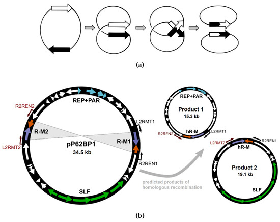 Hypothetical homologous recombination between the pP62BP1 R-M systems. (a) Theoretical model of DNA recombination between homologous sequences found with the same orientation in a circular DNA molecule. (b) Predicted products of the homologous recombination between the pP62BP1 R-M systems. Hypothetical ‘hybrid’ R-M systems (hR-M) are indicated. Neither of the predicted products was identified experimentally. Binding sites for primers used for PCR-based screening are indicated (cf. Figure S7). Colors correspond to the main genetic modules of the plasmid.