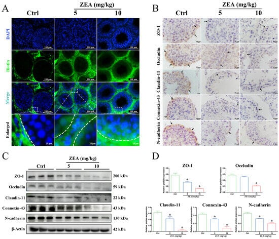 The localization and expression of junctional proteins are usually used to evaluate the integrity of the BTB structure [16]. In this study, IHC analysis was performed to detect changes in the distribution and expression of critical proteins (Figure 2B), including TJ proteins (ZO-1, Occludin, and Claudin-11), GJ protein (Connexin-43), and ES protein (N-cadherin). In the control group, the positive immunoreactions of ZO-1, Occludin, Claudin-11, Connexin-43, and N-cadherin proteins were predominantly detected along the circumference near the basal region of the seminiferous tubules between SCs and spermatogenic cells (black arrow). After ZEA exposure, the positive staining of these proteins decreased dramatically, although the protein expression localization was identical to that in the control group. Furthermore, the expression levels of these BTB junctional proteins were verified by Western blot analysis (Figure 2C,D). Consistent with the IHC results, the protein levels of ZO-1, Claudin-11, Connexin-43, and N-cadherin were significantly decreased after ZEA exposure at 5 mg/kg and 10 mg/kg compared to the control group (p < 0.05). In addition, a significantly reduced expression of Occludin protein was detected in the 10 mg/kg ZEA group compared to the control group (p < 0.05). These results revealed that ZEA exposure evidently disrupted the integrity of the BTB in goat testes.