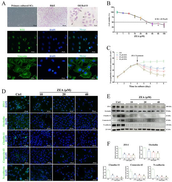 Primary SCs were isolated from goat testes and used for the in vitro ZEA treatment to validate the adverse impact of ZEA on BTB integrity. The morphology and purity of SCs were identified by H&E staining, Oil red O staining, and IF staining (Figure 3A). The staining results of the specific SC markers WT1 and Vimentin confirmed that the successfully isolated SCs had high purity. The obtained goat SCs were exposed to different concentrations of ZEA for 24 h, and then the cell viability was determined by CCK-8 (Figure 3B). SC viability showed a dose-dependent decrease, and cell viability was significantly reduced when the concentration of ZEA was 10 μM or higher (p < 0.05). The IC50 of SCs exposed to ZEA was under the concentration of 49.78 μM, and thus, exposure concentrations of ZEA of 10, 20, and 40 μM were selected for subsequent experiments.