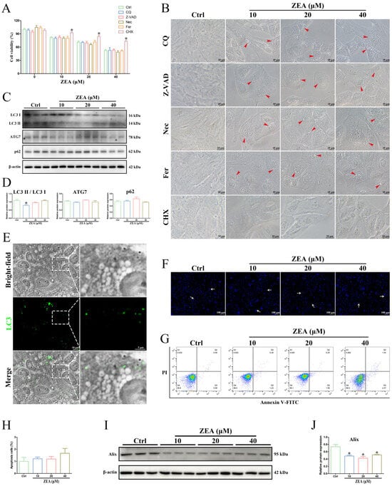 ZEA exposure triggered SC paraptosis. (A) Cellular viability was assessed using a CCK-8 assay. (B) Cellular morphologies were observed by light microscopy. Red arrowhead: cytoplasmic vacuoles. SCs were pretreated with 25 μM Chloroquine, 25 μM Z-VAD-FMK, 20 μM Necrostatin-1, 10 μM Ferrostatin-1, and 5 μM Cycloheximide, respectively, followed by ZEA treatment. CQ: Chloroquine; Z-VAD: Z-VAD-FMK; Nec: Necrostatin-1; Fer: Ferrostatin-1; and CHX: Cycloheximide. (C) The expression of autophagic markers (LC3, ATG7, and p62) in SCs was examined by Western blot. (D) Quantitation of the protein expressions of LC3II/LC3I, ATG7, and p62. (E) The distribution of LC3 in SCs was detected by immunofluorescence. SCs were exposed to 40 μM ZEA for 24 h. The white dotted boxes are magnified on the right (scale bars = 5 μm). LC3: green fluorescence. Nuclear (DAPI): blue fluorescence. Scale bars = 10 μm. (F) The nuclear morphology of SCs was measured by Hoechst 33342 staining. White arrow: apoptotic cells (nuclei with high intense blue fluorescence). Scale bars = 100 μm. (G,H) Apoptosis was measured by Annexin V-FITC/PI flow cytometry analysis. (I) The expression of the BTB functional protein Alix in SCs was examined by Western blot. (J) Quantitation of Alix protein expression. * p < 0.05 versus the control group (Ctrl).