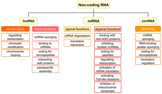 The ncRNA family is classified into various subgroups determined by both the size and structure of the molecules. The most studied classes of ncRNAs are miRNAs, lncRNAs, and circRNAs, the functions of which are summarised in Figure 1.