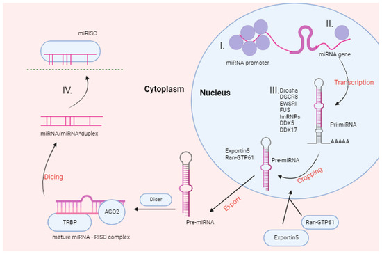 ncRNAs with over 200 nucleotides are known as lncRNAs, whereas “small ncRNA” is a general term that encompasses all molecules shorter than 200 nucleotides [7]. miRNAs represent the most studied class among small ncRNAs. Originating from extended stem–loop structures, miRNAs possess the ability to bind to and suppress mRNAs [8]. The biogenesis of miRNAs involves a sequential process, beginning with their transcription as primary miRNAs (pri-miRNAs). Subsequently, in the nucleus, Drosha and DGCR8 undertake the processing of pri-miRNAs, leading to the formation of precursor miRNAs (pre-miRNAs). Once transported to the cytoplasm, pre-miRNAs undergo Dicer-mediated cleavage, resulting in the creation of an miRNA/miRNA duplex (Figure 2). Notably, only one of these miRNAs executes its inhibitory role, while the other undergoes degradation [9]. Furthermore, miRNAs exhibit atypical functions, including the inhibition of mitochondrial transcripts, activation of mRNA translation, binding and inhibition of proteins, coding for peptides, triggering of transcription, activation of Toll-like receptors, and inhibition of nuclear ncRNAs [10,11]. These varied functions underscore the complexity and versatility inherent in miRNAs as molecular entities.