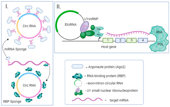Mechanisms of circRNA functioning. (I) One prominent function of circRNAs is their ability to act as molecular sponges for miRNA/RBP, effectively sequestering these molecules away from their mRNA targets. This leads to gene expression alterations. (II) circRNAs can interact with U1 snRNP, facilitating their interaction with transcription complexes at host genes and subsequently inducing transcription of these genes.