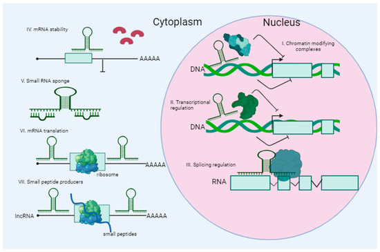 lncRNAs are transcripts composed of more than 200 nucleotides that do not serve as blueprints for protein synthesis. These lncRNAs constitute roughly 70% of all ncRNA types. The human genome is rich in lncRNAs, which are crucial for a wide range of biological functions (Figure 4). Most of these transcripts undergo polyadenylation and splicing and are found in the nucleus and, in particular, in chromatin-associated fractions [120,121]. According to their localization, many lncRNAs are associated with the regulation of gene expression and the formation of the three-dimensional organization of the nucleus. lncRNAs play important roles in different physiological and pathological processes in cells interacting with DNA, RNA (including miRNA), and various proteins [122]. It has been shown that lncRNAs can interact with some proteins involved in transcription, and they can also control various steps in the post-transcriptional processing of mRNA.