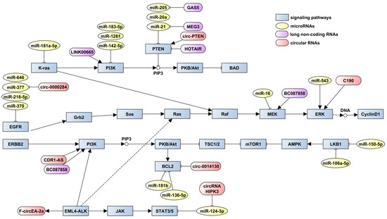 Schematic map of key NSCLC signaling pathways influenced by ncRNA regulators. Abbreviations: K-ras—protein encoded by the KRAS (Kirsten rat sarcoma viral) gene; PI3K—phosphatidylinositol 3-kinase; PIP3—phosphatidylinositol-3,4,5-triphosphate; PTEN—phosphatase and tensin homolog; PKB/Akt—protein kinase B, also known as Akt; BAD—Bcl-2-antagonist of cell death; EGFR—epidermal growth factor receptor; Grb2—growth factor receptor-bound protein 2; Sos—Son of Sevenless; TSC1/2—tuberous sclerosis complex 1/2; mTOR—mammalian target of rapamycin; AMPK—AMP-activated protein kinase; LKB1—liver kinase B1; EML4—echinoderm microtubule-associated protein-like 4; JAK—Janus kinase; STAT—signal transducer and activator of transcription.