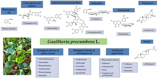Gaultheria procumbens L. (American wintergreen, eastern teaberry), belonging to the Ericaceae family, is a small, low-growing shrub native to northeastern North America [1]. The plant has been used for hundreds of years in traditional medicine to treat disorders connected with inflammation or infection, especially rheumatoid arthritis, influenza, the common cold, and fever [2,3]. Historical reports on the chemical composition date back to the second half of the 19th century and relate mainly to methyl salicylate as the dominant component of G. procumbens essential oil (wintergreen oil) [4,5,6,7,8]. Later phytochemical research allowed the identification of over 70 bioactive constituents classified as simple phenolic acids, chlorogenic acid isomers, methyl salicylate glycosides, flavonoids, and proanthocyanidins among polyphenols, as well as triterpene acids and sterols [2]. The biological activity studies were mainly focused on the anti-inflammatory, antioxidant, and photoprotective activity of the plant extracts [2,3] as well as antimicrobial potential, such as antibacterial, antifungal, insecticidal, and larvicidal activities of the wintergreen oil [9,10]. G. procumbens is also of great industrial importance due to its culinary, cosmetic, and decorative qualities since it is a frequent food flavouring additive, a cosmetic ingredient of skin care products, and a popular ground cover plant [11,12,13], as shown in Figure 1.
