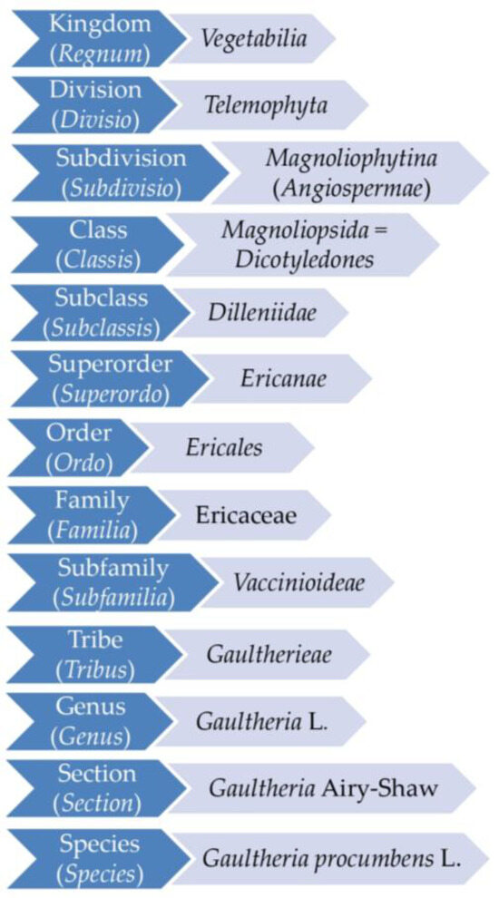 The genus Gaultheria L. (Ericaceae), widely distributed in the Americas, East Asia, and Oceania, has about 150 species. The complete taxonomic position of the genus and the species G. procumbens, following the latest phylogenetic research [14,15,16,17], is presented in Figure 2.