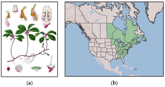 Gaultheria procumbens L.: (a) whole plant; (b) area of natural occurrence in North America marked in green [34].