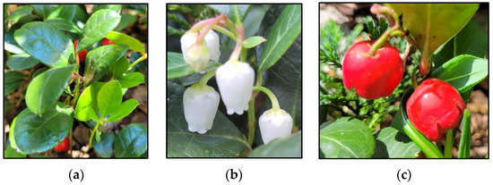 Gaultheria procumbens L.: (a) leaves; (b) flowers; (c) fruits (pictures taken by authors).