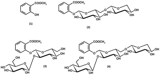 Methyl salicylate (1) and its glycosidic derivatives: gaultherin (2), physanguloside A (3), and 2-O-β-D-glucopyranosylgaultherin (4).