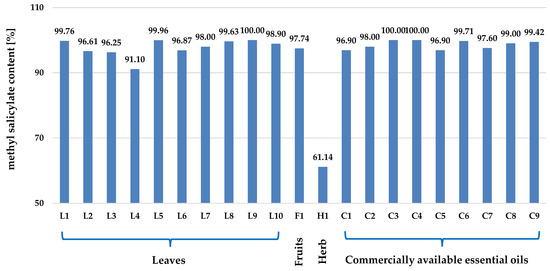 The content of methyl salicylate in essential oils distilled from leaves (L1–L10), fruits (F1), and herbs (aerial parts, H1) of G. procumbens and in commercially available G. procumbens essential oils (C1–C9). References: L1 [10], L2 [39], L3 [40], L4 [41], L5 [42], L6 [43], L7 [44], L8 [45,46], L9 [47], L10 [48], F1 [10], H1 [49], C1 [9], C2 [50], C3 [51], C4 [52], C5 [53], C6 [54], C7 [55], C8[56], C9 [57,58].