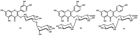 Flavonoid aglycones, i.e., quercetin and kaempferol, belonging to the class of flavonols, were identified in the hydrolysates from aerial parts of G. procumbens in the early 1990s [65]. Further analyses of the non-hydrolysed extracts revealed only traces of the two aglycones and the prevailing glycosides. A total of 14 flavonoid glycosides, including 11 monoglycosides and 3 diglycosides, have been identified in the plant, indicating a significant structural diversity of the G. procumbens flavonoid fraction, as shown in Figure 7 and Figure S3 and Table 3.