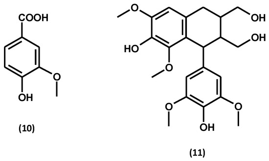 Other phenolic and polyphenolic compounds: vanillin (10) and lyoniresinol (11).
