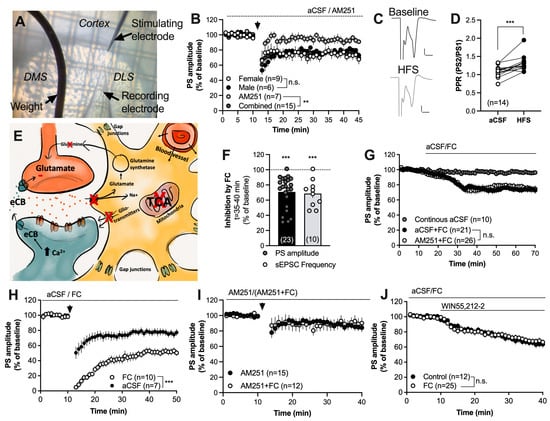 Inhibition of the TCA cycle in astrocytes facilitates striatal HFS-LTD. (A) Micrograph demonstrating the position of recording and stimulating electrodes in the DLS. (B) HFS induced LTD in brain slices from both female and male rats in a CB1R-dependent manner. (C) Example traces demonstrating evoked field potentials at baseline (black) and after HFS (gray). Calibration: 0.2 mV, 2 ms. (D) The PPR was significantly enhanced following HFS, indicating that synaptic depression is associated with a decrease in the probability of transmitter release. (E) Schematic and simplified drawing of the tripartite synapse. Striatal astrocytes are extensively interconnected through gap junction channels and form a syncytium that may even include cortical astrocytes. Astrocytes may regulate neurotransmission through the clearance of glutamate by releasing gliotransmitters and by influencing neurovascular coupling. Inhibition of the TCA-cycle in astrocytes using the metabolic uncoupler FC has been demonstrated to decrease the clearance of glutamate resulting in reduced release of the substrate glutamine. Incubation with FC further leads to reduced release of gliotransmitters and bioactive molecules, and impaired astrocytic calcium signaling [39,40,50,51]. (F) Perfusion of FC (5 μM) for 30 min depressed the evoked PS amplitudes and reduced the frequency of glutamatergic inputs onto MSNs. (G) Synaptic depression induced by FC was not CB1R-dependent. (H) Facilitation of HFS-LTD was observed in slices pretreated with FC for at least 60 min and continuously throughout the experiment. (I) The CB1R antagonist prevented HFS-LTD in both aCSF- and FC-treated slices, suggesting that facilitation of LTD is associated with eCB signaling. (J) Synaptic depression induced by the CB1R agonist was not enhanced during the metabolic inhibition of astrocytes. Data are mean values ± sem. Arrows mark time-points for HFS. n = number of recordings, taken from at least four animals. n.s. = not significant. ** p < 0.01; *** p < 0.001.