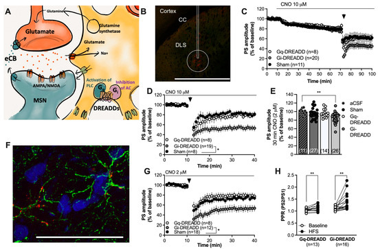 In the next set of experiments, astrocytes were targeted using chemogenetic approaches. Striatal cells were transfected with Gi- or Gq-coupled DREADDs targeting GFAP and perfused with the agonist CNO. Immunohistological staining demonstrated that DREADD expression was associated with GFAP, and the main area of expression was relatively restricted to the injection site. While a higher concentration of CNO (10 µM) slightly depressed evoked PS amplitudes in all treatment groups, a lower concentration (2 µM) selectively inhibited PS amplitudes in brain slices expressing Gi-coupled DREADDs. While DMSO could have affected neurotransmission, the proportion was only 0.05%. It is thus possible that higher doses of CNO may produce unspecific effects when applied in combination with electrical stimulation. Perfusion of 2 µM CNO selectively depressed the PS amplitude in brain slices from rats transfected with Gi-coupled DREADDs, but the relative depression was not as pronounced compared with FC and carbenoxolone disodium. Nonetheless, Gi-coupled DREADDs were associated with a robust enhancement of HFS-LTD, supporting the idea that the mechanisms triggering synaptic depression during drug perfusion (baseline conditions) may differ from the signaling pathways recruited during the facilitation of HFS-LTD [40]. It should be noted that the ability for DREADDs expressed in astrocytes to accurately mimic endogenous G-protein receptor activity has been discussed [46]. In addition, the capacity to activate or deactivate astrocytes via G-protein-coupled receptors have also been questioned [45,46]. However, while the activation of both astrocytic Gi- and Gq-coupled receptors may increase intracellular [Ca2+]i in astrocytes, the downstream signaling pathways, including phospholipase C and protein kinase A, still appear to be sufficient to produce specific and functional outputs [65,66,67,68].