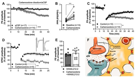 Striatal astrocytes are extensively interconnected via gap junctions, and the astroglial syncytium enables the transport of different substrates of importance for neurotransmission. In the next set of experiments, slices were treated with the gap-junction blocker carbenoxolone disodium (100 µM), which rapidly suppresses cell-to-cell coupling between striatal astrocytes [50]. Carbenoxolone disodium significantly depressed the PS amplitude by itself (F(1,31) = 16.9, p < 0.001) (Figure 3A) and increased the PPR (t(13) = 5.587, p < 0.001) (Figure 3B), suggesting that synaptic depression is concomitant with a reduced probability of transmitter release.