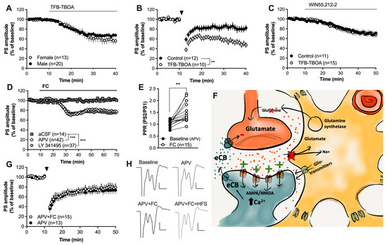 Glutamatergic neurotransmission is pivotal for postsynaptic eCB production and release [19,22], and astrocytes are key regulators of extracellular glutamate. To assess if elevated glutamate levels could underly the facilitation of HFS-LTD, slices were perfused with the glial-specific glutamate-transporter inhibitor TFB-TBOA (200 nM). TFB-TBOA depressed the evoked PS amplitude in a sex-independent manner (F(1,31) = 0.2982, p = 0.5889) (Figure 4A) and facilitated HFS-LTD (F(1,29) = 9.755, p = 0.0040) (Figure 4B), suggesting that increased glutamate signaling caused by impaired astrocyte function could act to enhance striatal eCB signaling. Perfusion for 30 min with TFB-TBOA prior to WIN55,212-2 and continuously throughout the experiment did not affect the synaptic depression induced by CB1R activation (F(1,24) = 0.03370, p = 0.8559) (Figure 4C).