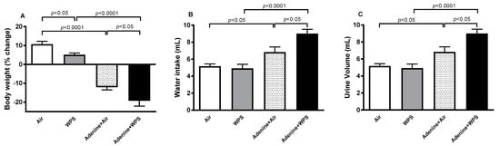 Compared with air group, the exposure to WPS induced a slight but a significant decrease in the % of body weight change (p < 0.05). Likewise, there was a substantial decrease in the % of body weight change in adenine + air group versus air group (p < 0.0001). Moreover, WPS exposure in the adenine-treated group induced a significant decrease in the % of body weight gain when compared with adenine + air (p < 0.05) and WPS (p < 0.0001) groups (Figure 1A). Both the water intake and urine volume were significantly increased in the adenine + WPS group when compared with adenine + air (p < 0.05) and WPS (p < 0.0001) groups (Figure 1B,C).