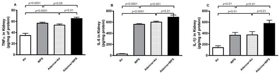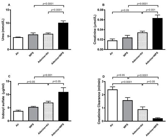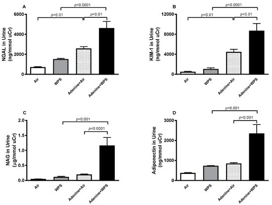 The concentrations of kidney injury markers NGAL and KIM-1 and the biomarker of proximal tubular damage in urine, NAG, and the marker for the progression of CKD adiponectin were all significantly increased adenine + WPS group when compared with adenine + air (p < 0.0001–p < 0.01) and WPS (p < 0.0001–p < 0.001) groups (Figure 3).