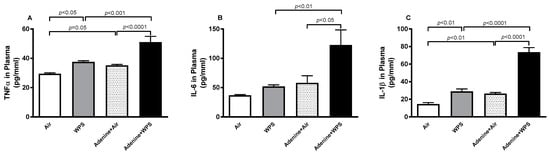 Tumor necrosis factor-α (TNFα; (A)), interleukin-6 (IL-6; (B)) and IL-1β (C) concentrations in plasma of mice exposed to either air or WPS for four weeks with or without adenine treatment to induce chronic kidney disease. Mean ± SEM (n = 8). The statistical analysis encompassed a one-way analysis of variance, with subsequent application of Holm–Sidak’s multiple comparisons test.