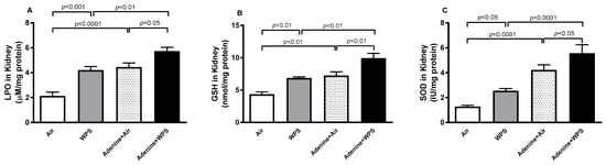 Concentrations of lipid peroxidation (LPO; (A)) and reduced glutathione (GSH; (B)) and activity of superoxide dismutase (SOD; (C)) in kidney homogenates of mice exposed to either air or WPS for four weeks with or without adenine treatment to induce chronic kidney disease. Mean ± SEM (n = 7–8). The statistical analysis encompassed a one-way analysis of variance, with subsequent application of Holm–Sidak’s multiple comparisons test.