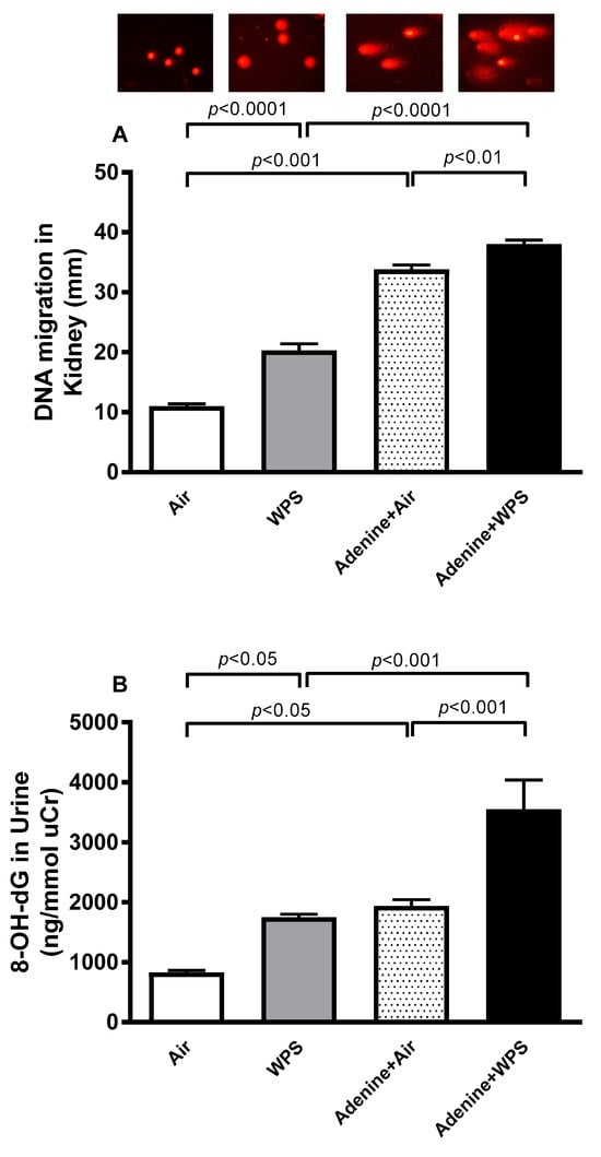 The DNA injury was assessed in the kidney tissue using a comet assay and in the urine by measuring 8-hydroxy-2′-deoxyguanosine (8-OH-dG), a marker of oxidative DNA damage (Figure 7). Both DNA migration in the kidney tissue, indicating DNA damage, and the concentration of 8-OH-dG in the urine were significantly increased in the WPS versus air (p < 0.0001–p < 0.05) and adenine + air versus air (p < 0.001–p < 0.05) groups. The latter effects were exacerbated in mice treated with adenine and exposed to WPS compared with either adenine + air (p < 0.001–p < 0.01) or WPS (p < 0.0001–p < 0.001) group.