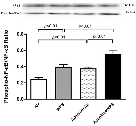 The phospho-NF-κB/NF-κB in kidney tissue homogenates was increased in WPS group when compared with air-exposed group (p < 0.01). In the same way, the phospho-NF-κB/NF-κB was increased in adenine + air group when compared with air group (p < 0.01). Interestingly, the phospho-NF-κB/NF-κB was more increased in the adenine + WPS group when compared with the adenine + air (p < 0.01) and WPS (p < 0.01) groups (Figure 8).