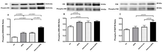 The phospho-p38/p38 was significantly increased in adenine + WPS versus either WPS (p < 0.05) or adenine + air (p < 0.05) (Figure 9C).
